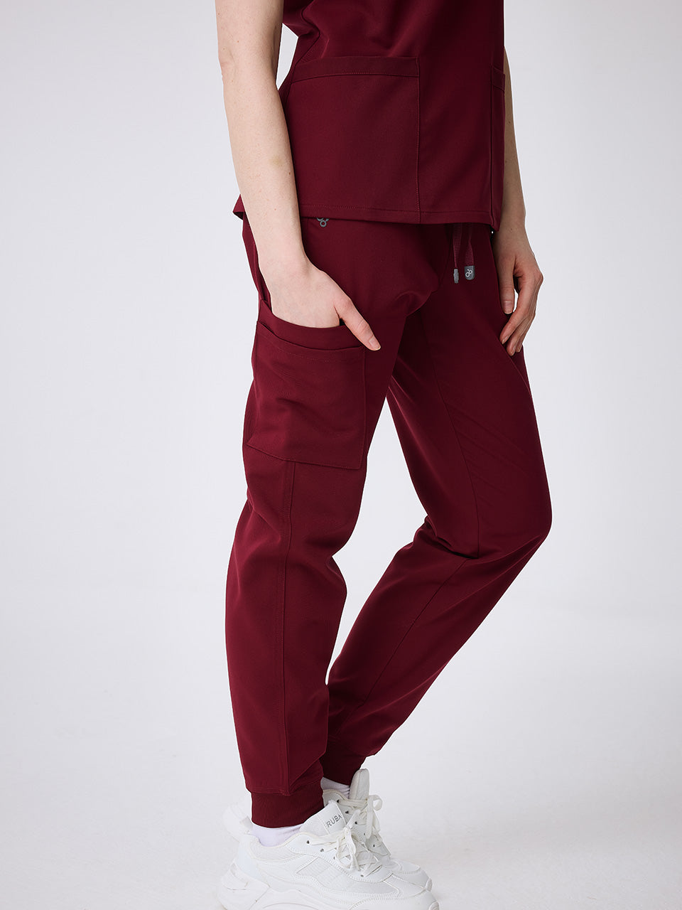 A soft elastic waistband with adjustable drawstring adapts to the body throughout the day, providing comfort without digging or shifting. Ribbed ankle cuffs keep the pants in place during constant motion, preserving a neat, professional appearance. Functional utility pockets are placed for easy access while staying discreet, maintaining a refined visual balance.